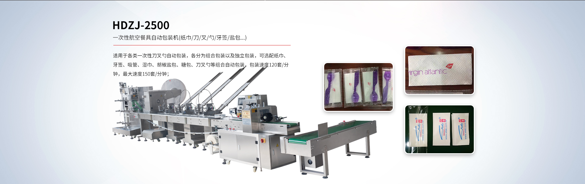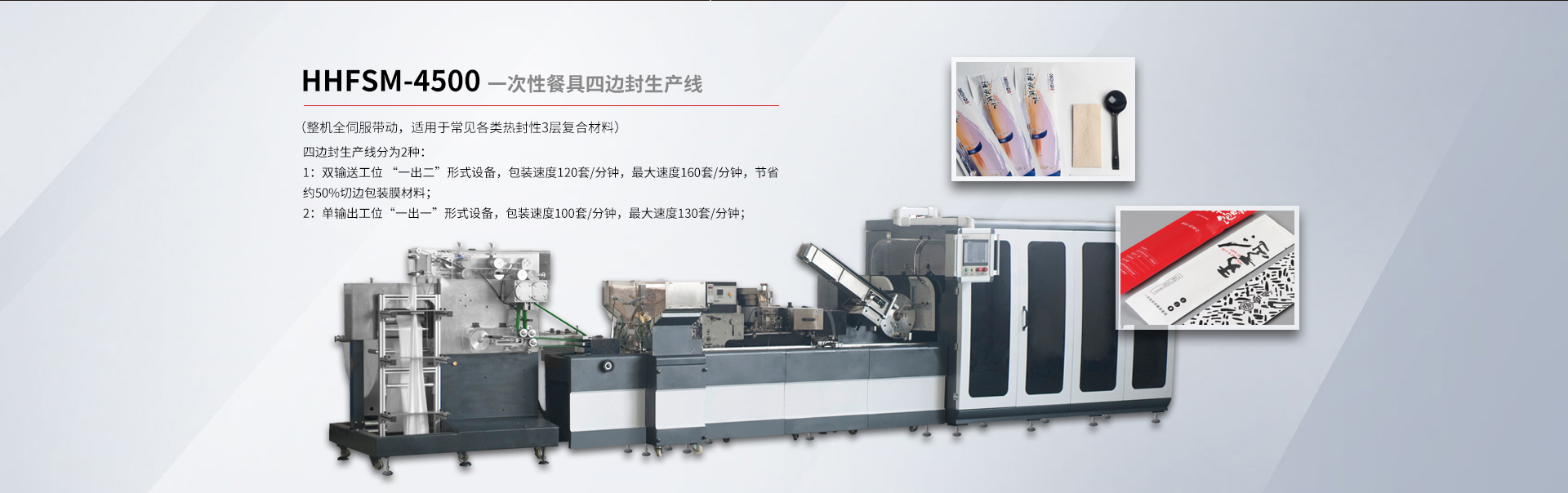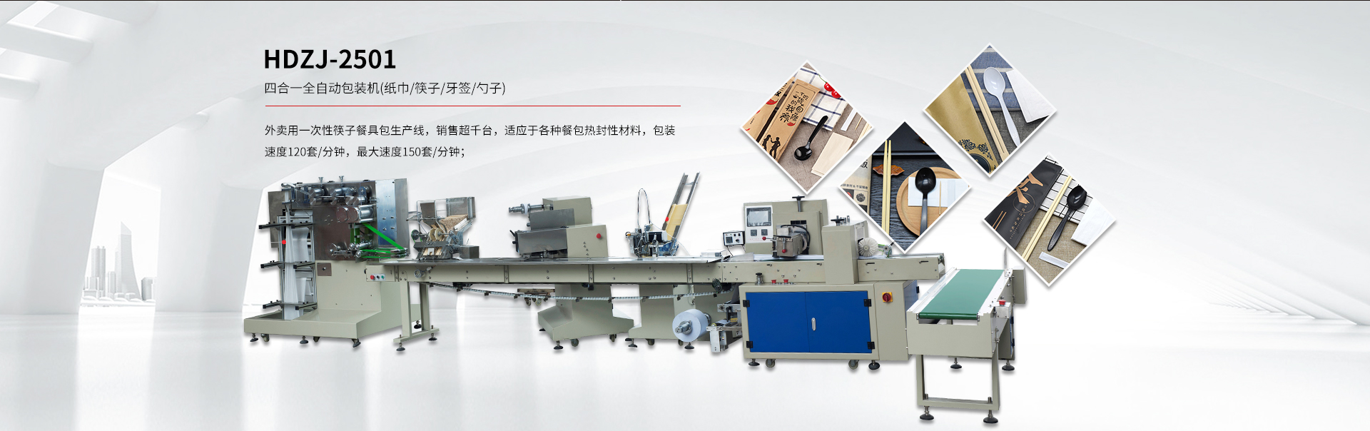 貴司專注于研發(fā)一次性紙巾筷子餐具包生產線、紙巾刀叉航空餐具包裝生產線、一次性餐具套裝四邊封生產線、塑料杯(碗)、吸管全自動點數自動包裝機及五金(塑料)制品包裝機等各類包裝機。
